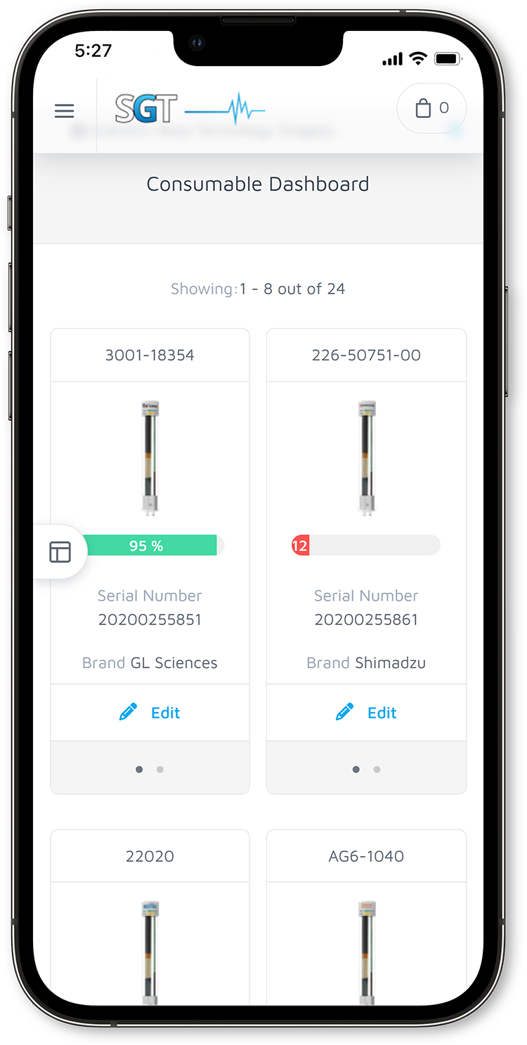 The consumable dashboard displays all consumables which are registered under your account or to which you have subscribed. The consumable dashboard gives you a quick overview of the status of all your consumables without having to scan the QR Code on the physical product each time.